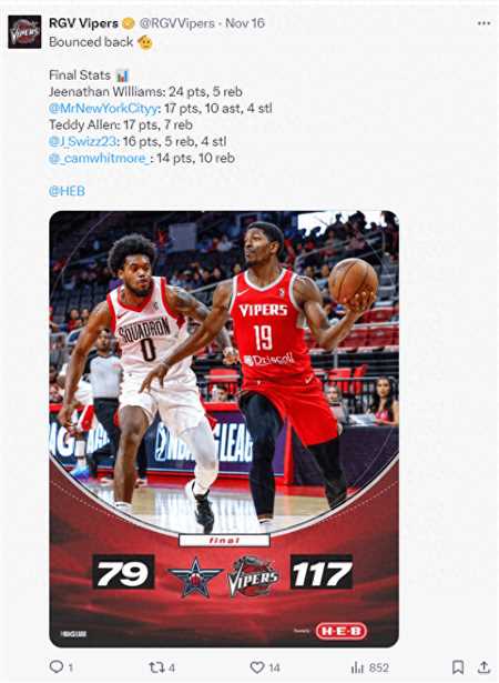 北京时间11月16日,nba g联赛,里奥格兰德河谷毒蛇队117-79复仇伯明翰中队,这场比赛上半场毒蛇就领先16分,第三节一波32-22后直接打入了垃圾时间。此役是两队背靠背的第二场,连续两天进行交手毒蛇1胜1负。