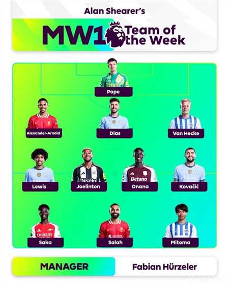新赛季英超首轮战罢,英超官方发布了英格兰名宿阿兰-希勒评选了本轮最佳阵容,萨拉赫领衔,萨卡、三笘薰、科瓦契奇在列。