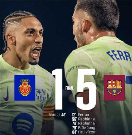 西甲联赛第19轮,巴塞罗那前往客场对阵马洛卡。上半场比赛,费兰-托雷斯为巴萨取得领先,主队由穆里奇扳平,拉菲尼亚随后错失单刀,半场结束,巴萨暂时1-1马洛卡;下半场,亚马尔造点+助攻,拉菲尼亚打进两球后比分来到3-1,随后德容、保-维克托各进一球,最终巴萨客场5-1马洛卡,近4轮联赛首次取胜,继续领跑积分榜。