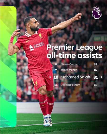 在与西汉姆联的英超第19轮比赛中,萨拉赫上半场传射建功,至此,萨拉赫英超生涯已送出81次助攻,超过贝克汉姆,独占英超历史助攻榜第十位。
