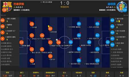全场比赛,巴萨的控球率为78%,一共有15次射门,其中4次射正;赫塔费一共有7次射门,其中仅有1次射正。