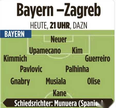 北京时间9月18日凌晨3点,欧冠联赛阶段第一轮,拜仁将在主场迎战萨格勒布迪纳摩。赛前,德国媒体《图片报》预测了本场比赛拜仁的首发。