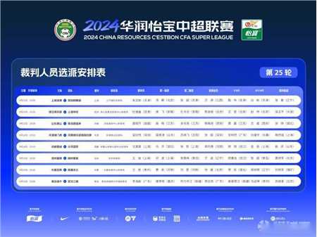 中国足协官方公布了中超第25轮比赛的裁判安排,朱文彬执法上海海港vs深圳新鹏城,沈寅豪执法成都蓉城vs北京国安。