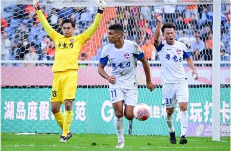 第43分钟,罗德里格右路下底传中,马里倒地铲射破门建功,梅州客家扳平比分。